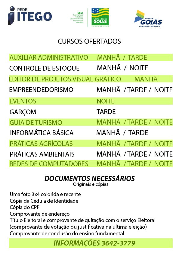 A unidade do ITEGO (Instituto Técnico de Goiás), localizado na Rua 65, esquina com Ruas 11/12, Setor Parque Lago em Formosa, anunciou a prorrogação do processo seletivo até o dia 5 de junho, para preenchimento das vagas de vários cursos que serão ofertados no Instituto.