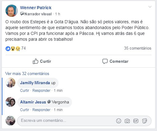 Através do grupo "Desabafo do Formosense" o Vereador Wenner Patrick (PSC) utilizando o facebook afirmou na tarde de hoje (17/04) de que: após a páscoa, reunirá assinaturas suficientes para abertura de uma CPI, para investigar o executivo municipal.
