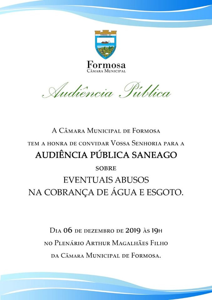 O objetivo da audiência é fomentar a discussão sobre à prestação de serviços de saneamento básico, feita pela Companhia de Saneamento de Goiás - Saneago em Formosa.