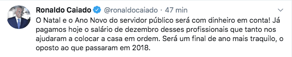 “O Natal e o Ano Novo do servidor público será com dinheiro em conta! Já pagamos hoje o salário de dezembro desses profissionais que tanto nos ajudaram a colocar a casa em ordem. Será um final de ano mais traquilo (sic), o oposto ao que passaram em 2018.”
