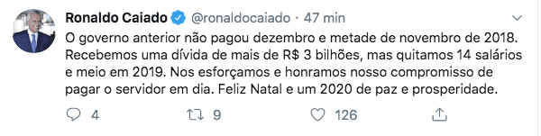 “O governo anterior não pagou dezembro e metade de novembro de 2018. Recebemos uma dívida de mais de R$ 3 bilhões, mas quitamos 14 salários e meio em 2019. Nos esforçamos e honramos nosso compromisso de pagar o servidor em dia. Feliz Natal e um 2020 de paz e prosperidade.”