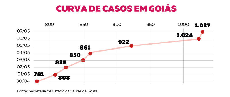 Em uma semana, o Estado de Goiás registrou 246 novos casos de infecção pelo coronavírus. Os números saltaram de 781 casos no dia 30 de abril para 1.027, nesta quinta-feira (7). Os dados são da Secretaria de Estado da Saúde (SES) e mostram um crescimento de 31,49% no período.
