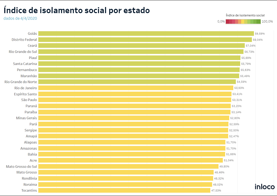 O estado de Goiás possui o maior índice de isolamento social do país, com 59,6% da população respeitando as recomendações. Os dados são de sábado (4), da empresa In Loco, que utiliza o georreferenciamento por celular para monitorar o isolamento social. As informações são analisadas pelo estado de Goiás, através da Secretaria de Desenvolvimento e Inovação (Sedi), para avaliar o nível de isolamento social do estado.