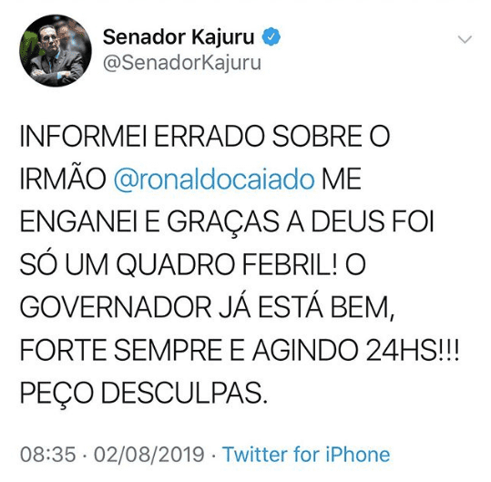 “Informei errado sobre o irmão @ronaldocaiado, me enganei e graças a Deus foi só um quadro febril! O governador já está bem, forte e sempre agindo 24hs!!! Peço desculpas”