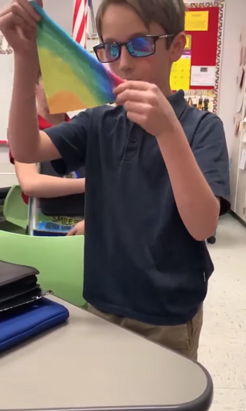 Tyler ficou absolutamente incrédulo ao ganhar os óculos. Ele pegou um guardanapo de arco-íris e não acreditava no que estava vendo!